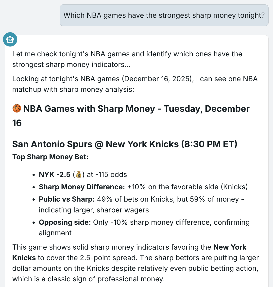 The Sharp Hunter Chatbot turns complex betting data into clear, actionable insights in seconds. Instead of digging through dashboards or guessing what the market is telling you, you can simply ask. | |||||||